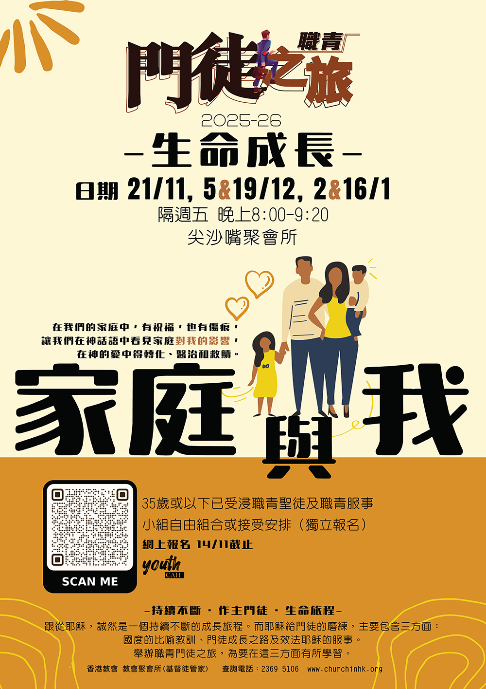 負擔及內容:在我們的家庭中,有祝福,也有傷痕,讓我們在神話語中看見家庭對我的影響,在神的愛中得轉化,醫治和救贖。
